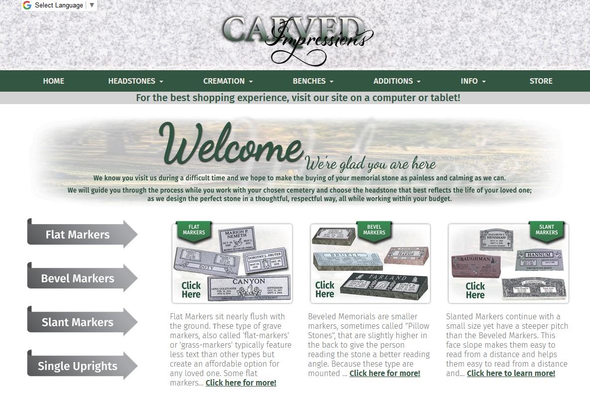 Carved Impressions Website Redesigning this website was a very in-depth process but an enjoyable one. With over 100 individual products, and 200 pages, this was no small feat to create this elaborate web of navigation and design. This project came together very well and the finished product is a great way to get quality grave markers to people who otherwise could not afford them.