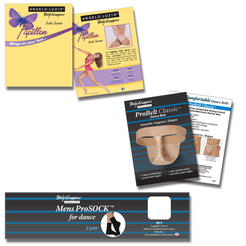 Most of the packaging that Body Wrappers uses to this day are designs that have been created by me. This includes what you see above; The Men's Belt Package, The Mens ProSOCK packaging, and the Papillon Sole Saver Packaging. |