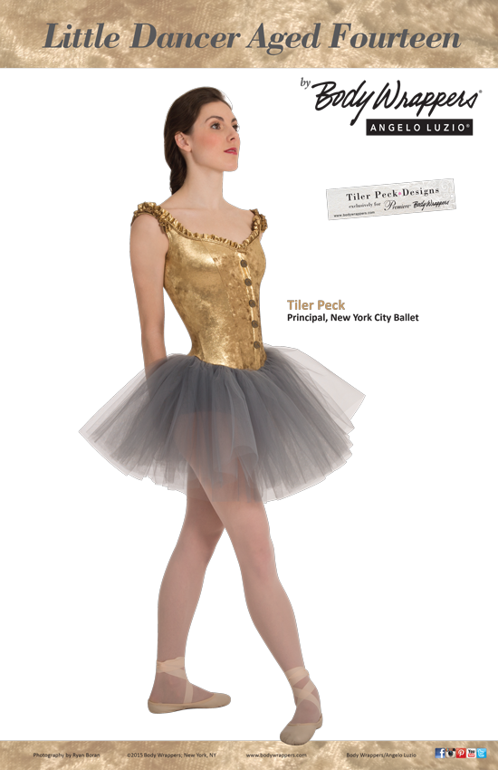 This garment and merchandising poster coincided with the theatrical debut of the Off-Broadway show "The Little Dancer" starring Tiler Peck. Body Wrappers/Angelo Luzio designed a companion garment to the show that was released in limited edition to stores nationwide. |