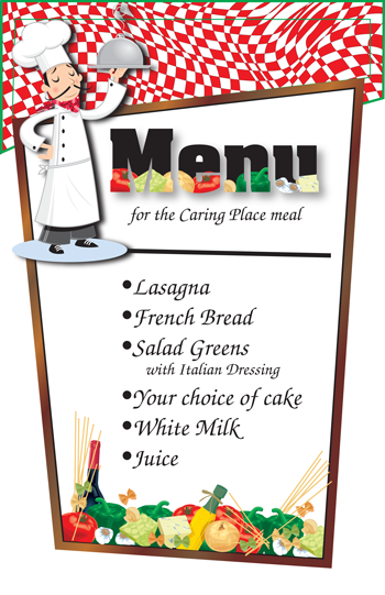 We as a congregation helped a local organization called The Caring Place to serve a meal to the less fortunate in our community once a month in Xenia. This was one of our menus I designed to hang at the start of the line. Table menus were also printed. |