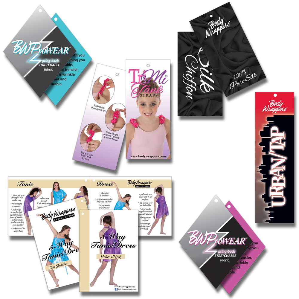 Many of the clothing tags and hangtags that I created for Body Wrappers can be seen above. Included are: The Tri-Me Tank, The Silk Chiffon Tag, The Urban/Tap Hangtag, The 5-Way Wrap/Dress, and two variations of the BWProwear Hangtag. |